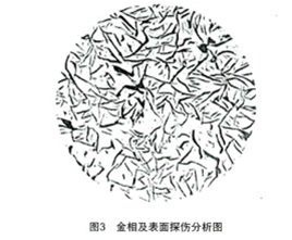 對不良產品中HT250材料進行金相及表面探傷分析如圖3所示,檢測結果表明,材料質量是在技術要求范圍內的,為此又對加工中變化的情況及一些細節進一步分析。通過對比試驗發現,之前考慮到提高粗糙度質量,刀具更換為帶修光刃的刀片,此類刀具刀尖半徑相對較小(車刀刀尖隨著圓弧的增大,徑向力也相應增大),為了減小徑向力,適當減小了刀尖圓弧半徑,導致在加工過程中刀具磨損速度不穩定,造成HT250材料中較粗石墨掉落現象,引起加工表面雖然產生了很多類似針孔,但探傷試驗為合格的現象。